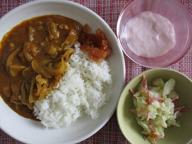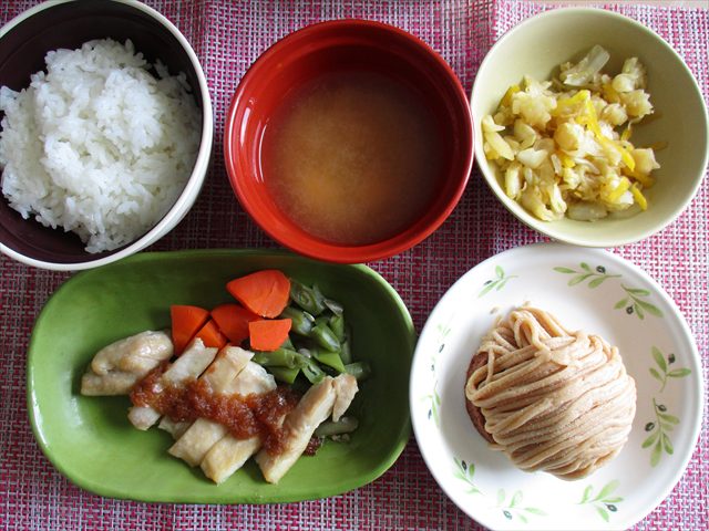ごはん、鶏肉のバター醤油ソース、キャベツと沢庵の和え物、