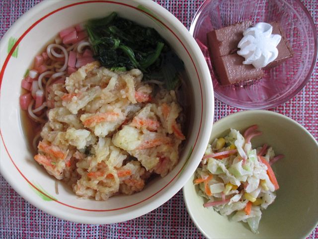 かき揚げそば、キャベツサラダと一緒に提供しました。