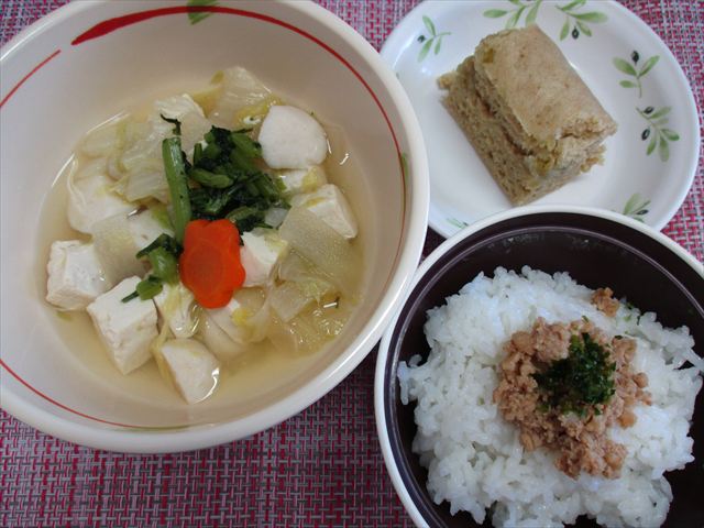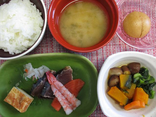 M様は刺身で、ごはん、炊き合わせ、味噌汁と一緒に提供しました。