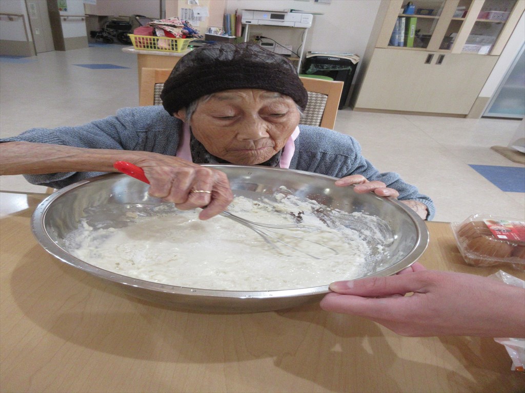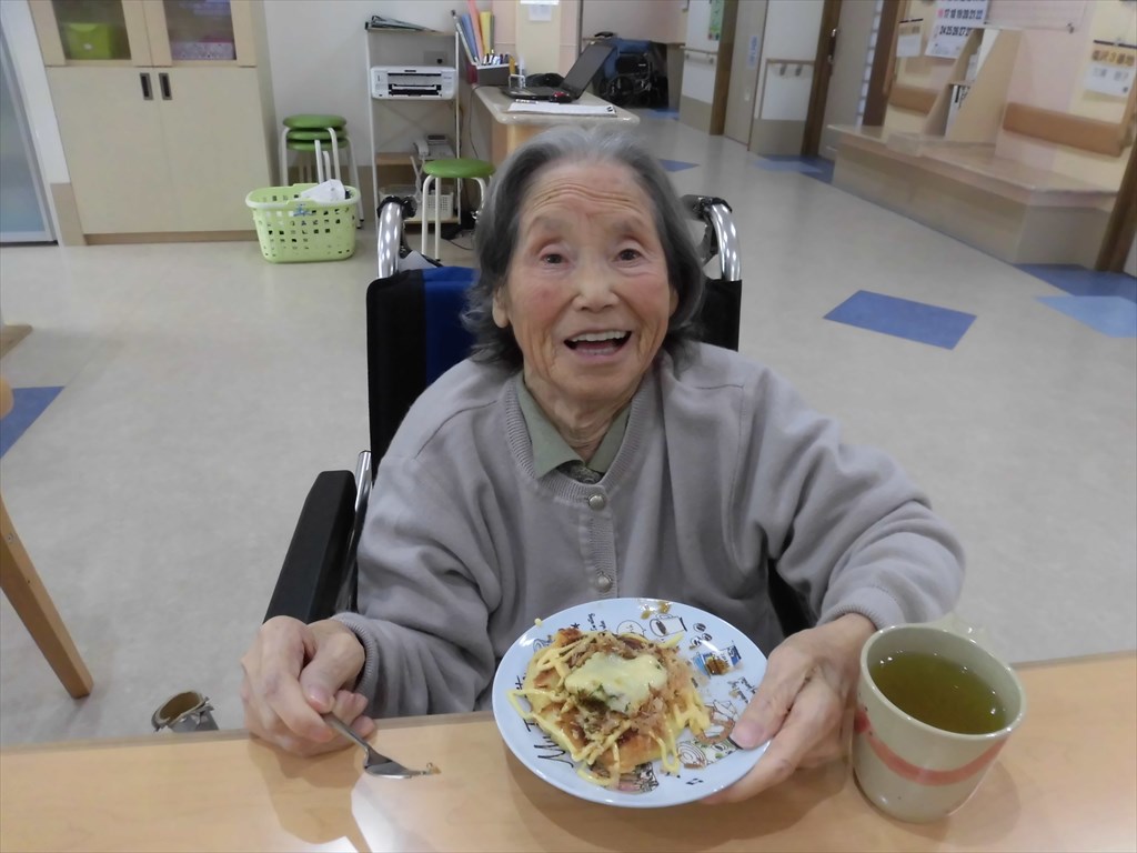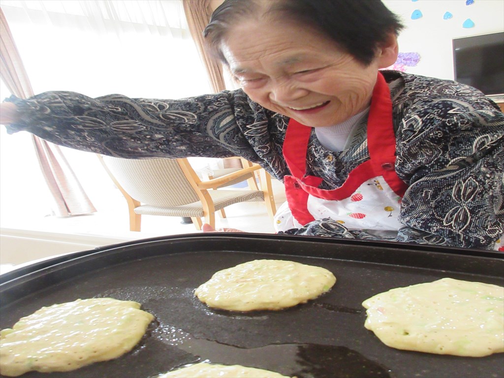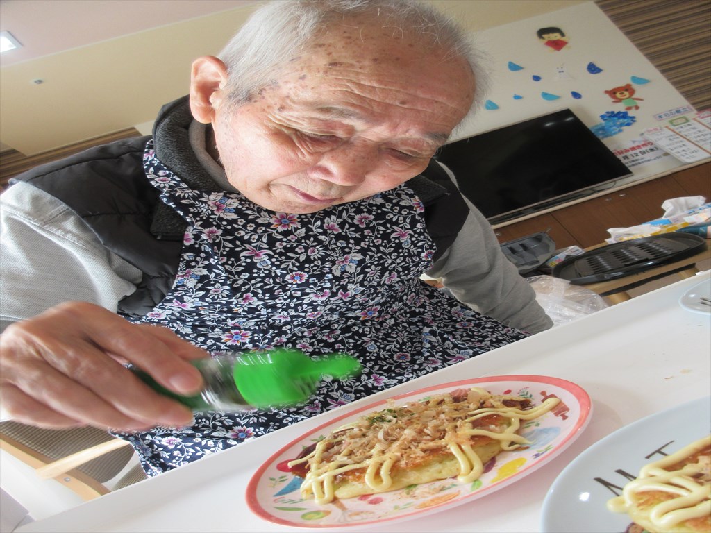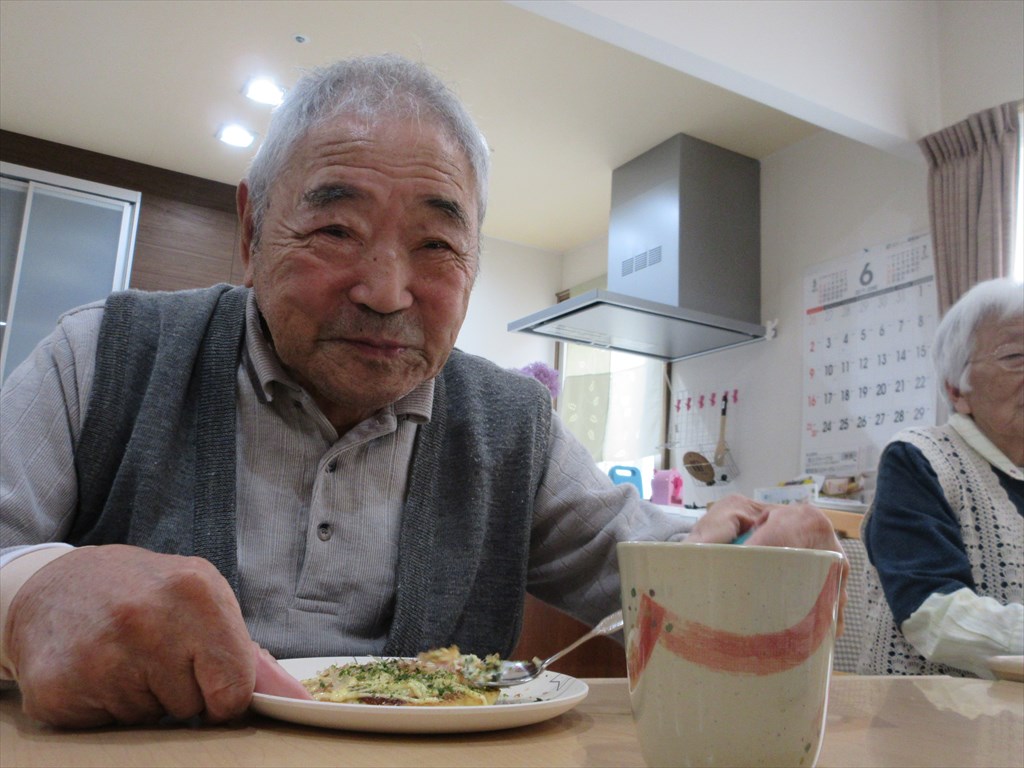 「お好み焼き作ったんだ~。」 岳・塩沢ショートステイでお好み焼きを作りました。 T・Hさんが生地作りを、T・Aさんには生地を焼いてもらい、 R・Sさんにトッピングを手伝っていただきました。 農作業が好きなR・Sさん、料理も楽しかったようで 「お好み焼き作ったんだ~。」と嬉しそうに話されていました(^^♪