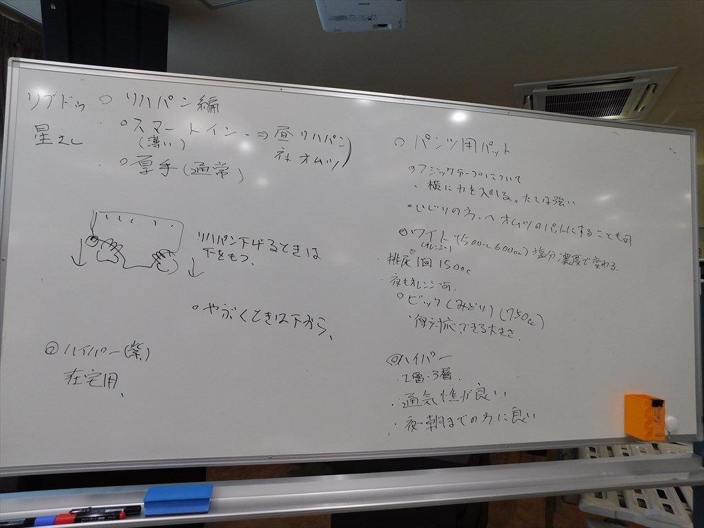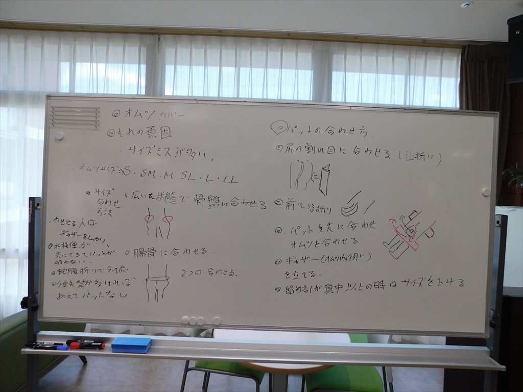 「リブドゥ」さんによるオムツの勉強会を行いました いつもお世話になっているオムツ業者「リブドゥ」さんによるオムツの勉強会を行いました。 パットの種類や特性、リハビリパンツ・オムツの当て方などを教えていただき、 施設のオムツに関する困難事例にもアドバイスをいただきました。 リブドゥさんありがとうございました。