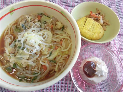 お誕生日献立♪ 11月2日は飯坂ユニット H様のお誕生日です♪ リクエストされたメニューはムースだったので・・・♪ 「小豆ムース」を提供しました♪ ◎野菜たっぷり醤油ラーメン ◎チキンピカタ ◎和風小豆ムース お誕生日おめでとうございます(^^)♪