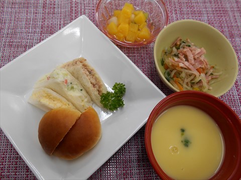 お誕生日献立♪ 5月1日は名目津ユニット W様のお誕生日でした! 希望されたメニューは「サンドイッチ」です♪ サンドイッチと一緒に、 大根サラダ・フルーツポンチ・コーンスープ を提供しました(^^) お誕生日おめでとうございます♪
