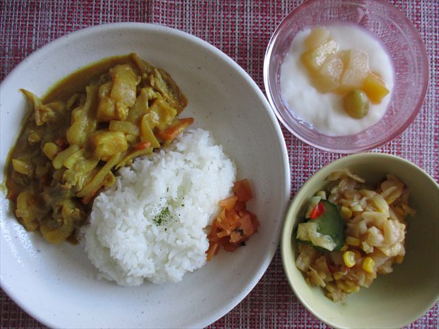お誕生日献立♪ 1/2にお誕生日を迎えられた方のご紹介です! 名目津ユニット M・S様です! いつもタオルたたみやエプロンたたみを 手伝っていただきありがとうございます! これからも元気で過ごせますようお手伝いさせていただきます! リクエストメニューは「カレーライス」で、 キャベツのサラダ、ヨーグルトデザートと一緒に提供しました! お誕生日おめでとうございます!!!!!