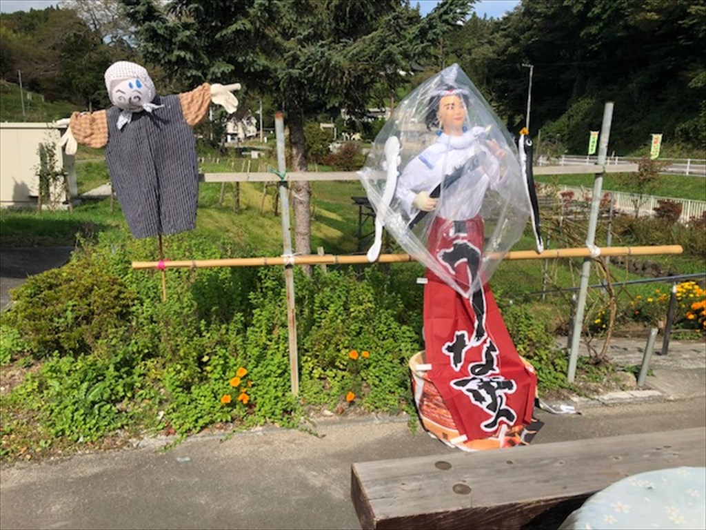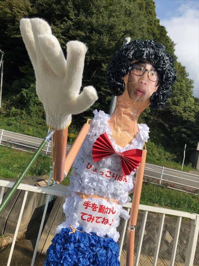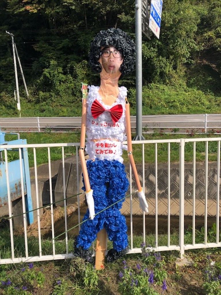 かかしコンテスト♪ 道の駅さくらの郷 道の駅 さくらの郷 かかしコンテストにエントリーしてきました♪ 今年は!! じゃーん!! ひょっこりはん♪ ヒューヒュー♪ なんと、腕がうごくんです(笑) 動かせる案山子なんです♪ 入居者さんには お花紙でお花をつくってもらいました。 菊人形風ひょっこりはんです♪
