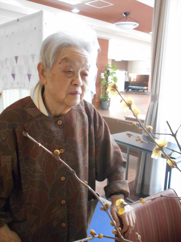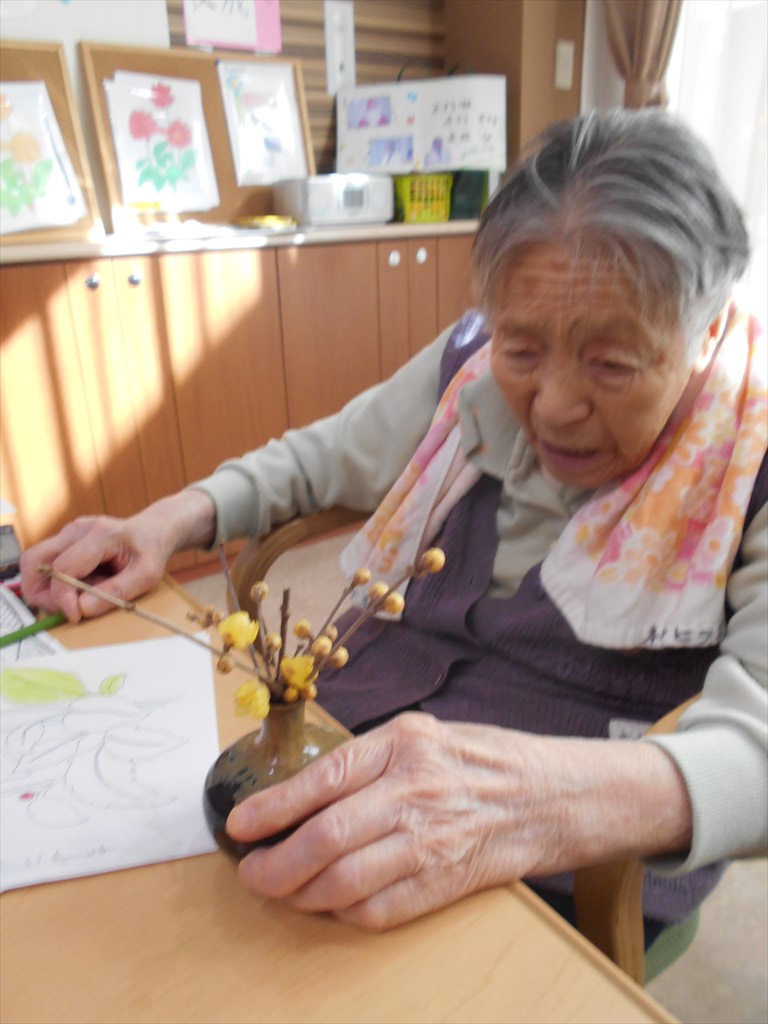 ふわりと漂う早春の香り♪ 職員と一緒に交流ホールまで荷物運びを手伝ってくださったTさん♪ 交流ホールがふわりといい香りに包まれている事に気づいた職員と カウンターまで行って見るとそこには「蝋梅」が! Tさん「あらきれいだー。これからどんどん咲くねー♪」 職員「ユニットのみなさんにも見せてあげたいですね!」 Tさん「いいない♪」 ユニットに少しおすそ分けしてもらい持って帰ると皆さんも 「あらー♪」「きれいだ!」 「蝋梅って言うの?初めて見たし初めて聞いた(笑)」 「うん、いい匂いだ♪」と喜びの声が聞かれました☆ 寒い時期に咲く蝋梅の花と香りを見つめながら、 暖かな春の訪れが一段と楽しみになったそんなひと時でした☆