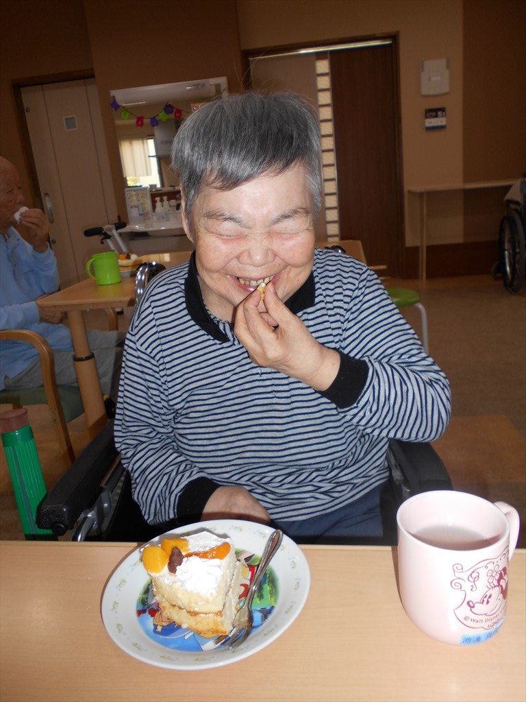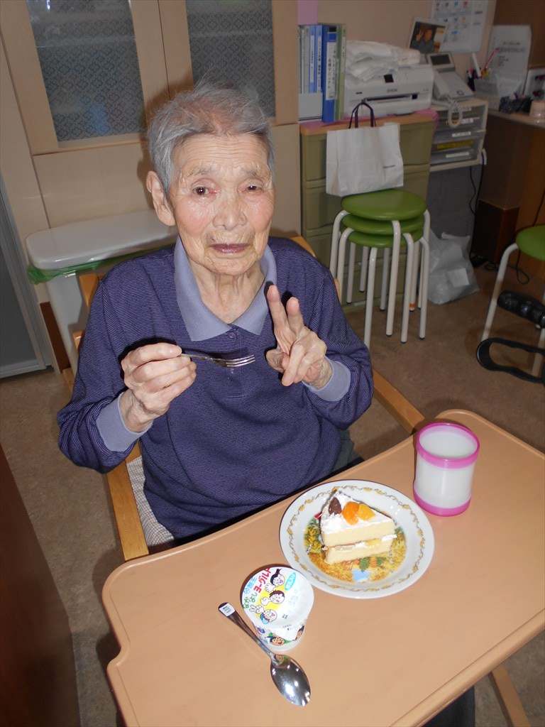 名目津ユニットで誕生日お祝い♪ 先日誕生日を迎えたMさん♪ おやつに職員手作りのケーキでささやかなお祝いをしました☆ 満面の笑みでピースをしてくださいました♪ そしてユニットのほかの皆さんもMさんを祝って一緒にケーキを召し上がりました。 Mさんこれからも元気で長生きしてくださいね!