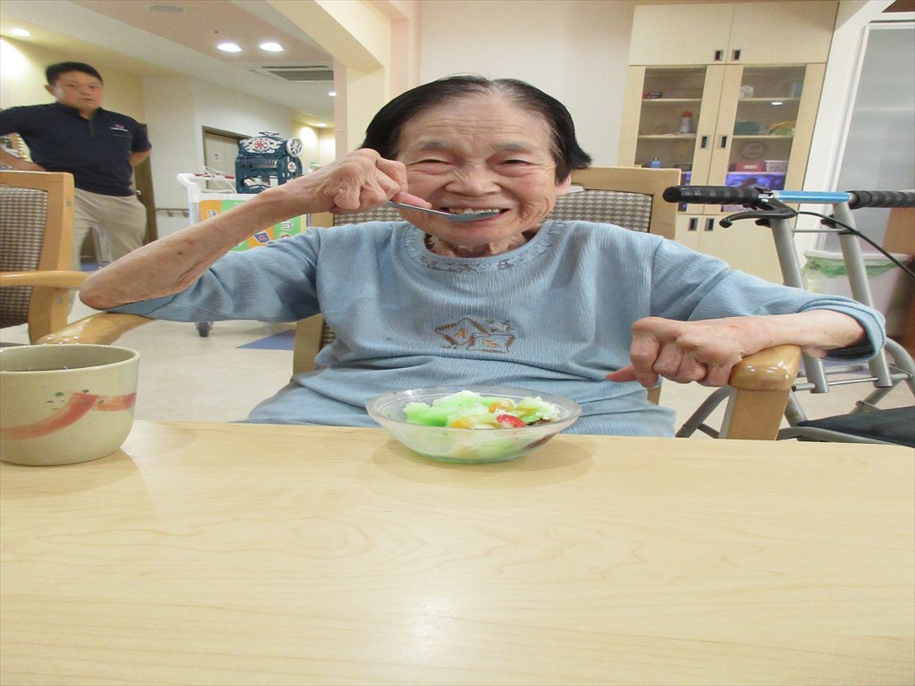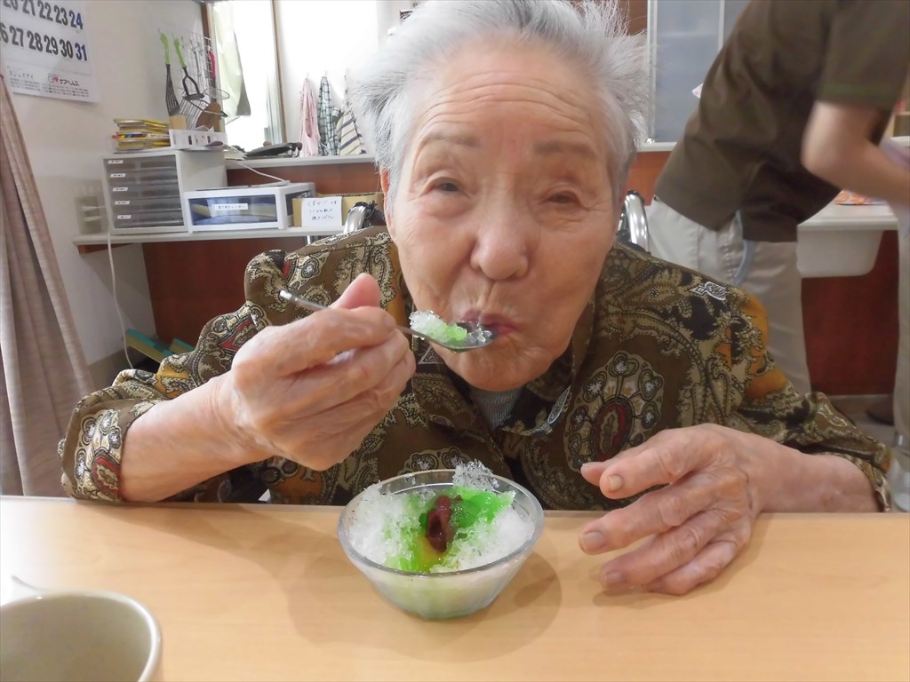 岳・塩沢ショートステイでは、かき氷作りを行いました♪ 暑い日が続きましたが、 皆さん体調は崩されていませんか? それぞれお好きな味を選んでいただき、 フルーツや小豆、練乳などをトッピングしました。 皆さん「ひゃっこくてうまい!!」と喜ばれていました(*^^)v
