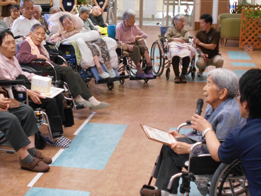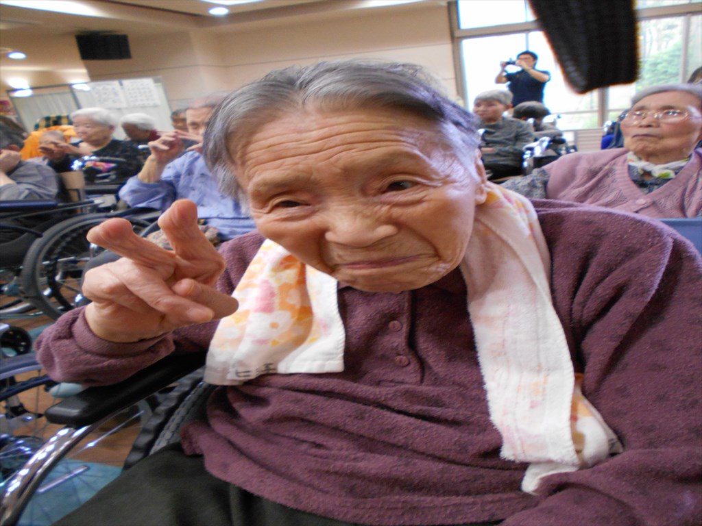 敬老会♪ 名目津・土湯ユニット 今日は天気に恵まれず悪天候で園児さん来れなかったけど その分多くの入居者の方に祝っていただき、今年百寿になる A.Y様もとてもうれしそうでした! これからも元気に健康に過ごしていきましょう!♪
