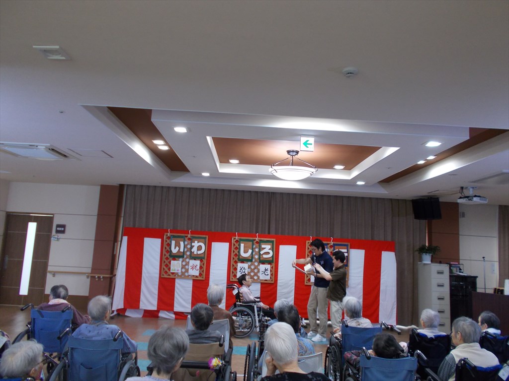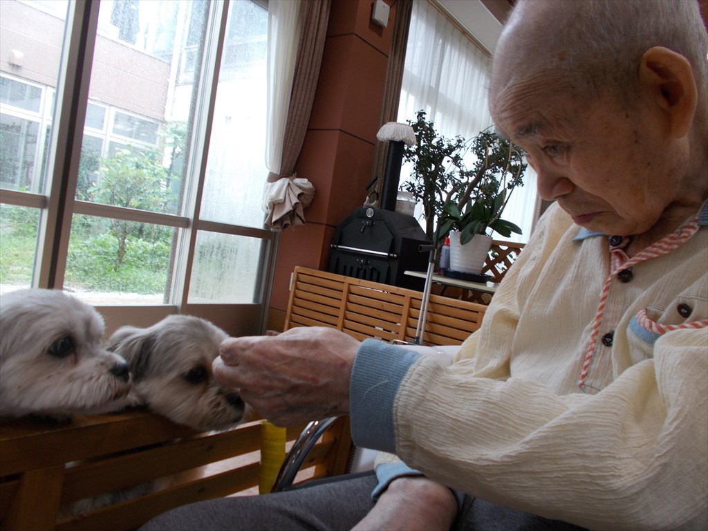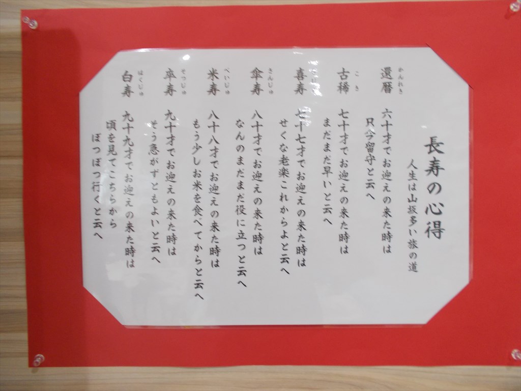 敬老会<芦ノ牧・湯野上ユニット> 芦ノ牧ユニットからは、T様が米寿の表彰を受けました。 名前を呼ばれた際には、うつむかれていましたが、 敬老会後、ぼん・めごのところに行くとパッと顔を上げ、 ぼんとめごを愛でておられました(*^^*) ユニットには、『長寿の心得』が! リビングに掲示しました(^^)v 「人生は、山坂多い旅の道」・・・ 還暦から白寿までじっくりと読むと、 なかなか面白いです(^^) なるほど~