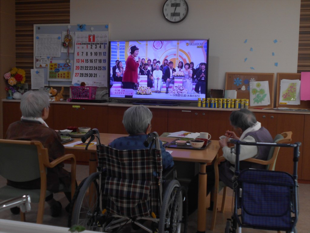 日曜のお昼の楽しみ恒例風景です♪ Hさん「今日のゲストってなんて名前の人だっけ?」 職員「なんて人だっけねー?あ、橋幸夫かな♪」 Hさん「あーそうだそうだ。ちっと見ねど忘れる(笑)」 なんて会話もあり Yさん「あの人面白い!あの帽子の色もいいしなー(笑)」 なんて笑いもあり。 ほのぼのと、そしていつもと変わりない 日曜の楽しみのひと時の風景に職員もほっこりした時間でした☆