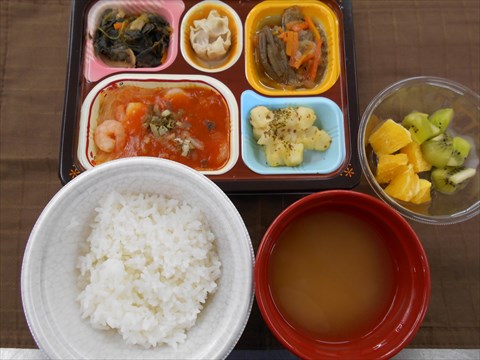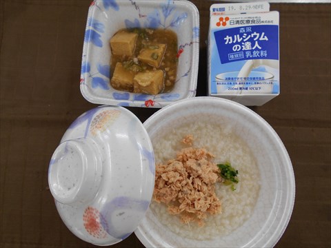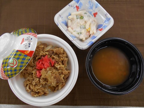 献立紹介♪ 8/25(日) いつもと違う日曜日を、をコンセプトとした 「みんなの日曜日」が実施されました。 いつもと雰囲気の違う食事に、利用者様は楽しんで召し上がっていたようです。 ◆ほっこり朝食 ◎さけ雑炊 ◎絹厚揚げとオクラのそぼろあん ◎牛乳 ◆おでかけランチ ◎吉野家牛丼 ◎マカロニサラダ ◎けんちん汁 ◆いろいろおかずのお夕飯 ◎ごはん ◎エビチリセット ◎フルーツ盛り合わせ ◎味噌汁