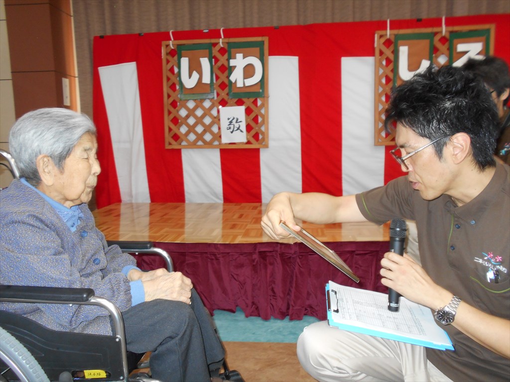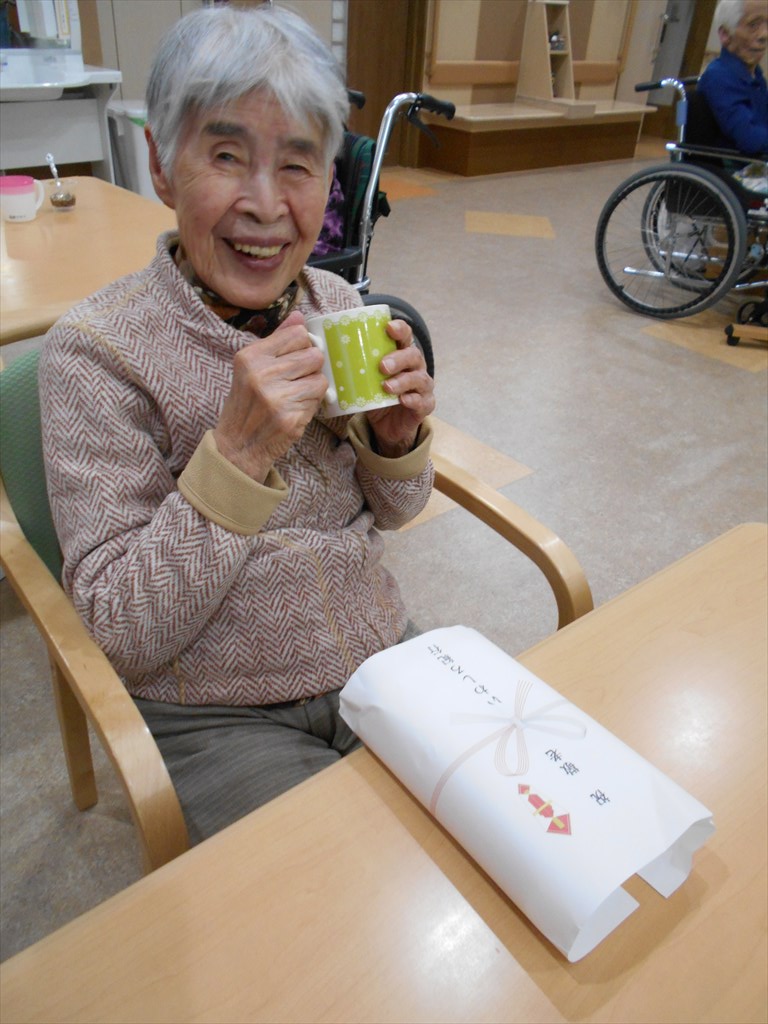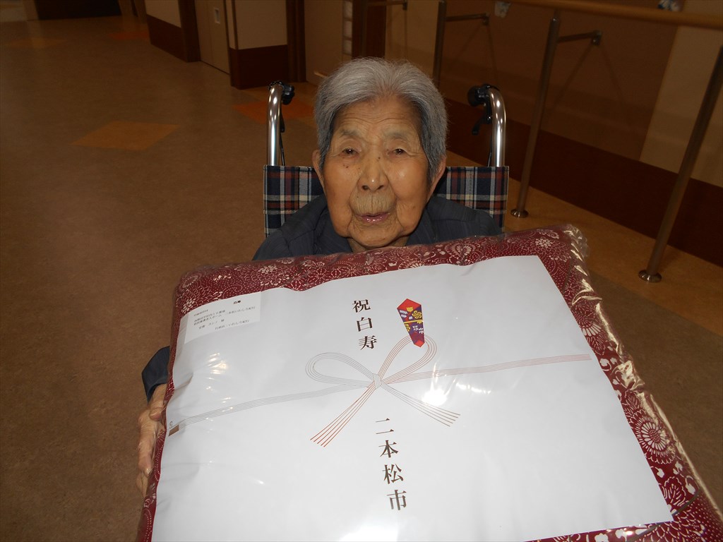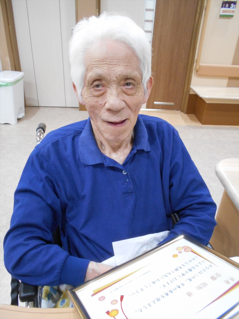 長寿のお祝い♪ 名目津・土湯編 今年、 喜寿・傘寿・米寿・卒寿・白寿・百寿を迎えられた皆さんに 敬老会で表彰状をお渡しいたしました。 二本松市からも祝寿を迎えられた方へ 記念品の贈呈がありました。 今年白寿を迎えられるY様。 皆さんの前に出る事が恥ずかしいとおっしゃっていましたが、 表彰状を受け取る際には感動の涙があふれていました☆ ユニットへ戻ってからも改めて記念撮影をしました♪ 皆さんこれからも元気でそして素敵な笑顔で毎日をお過ごしください! 本当におめでとうございます☆