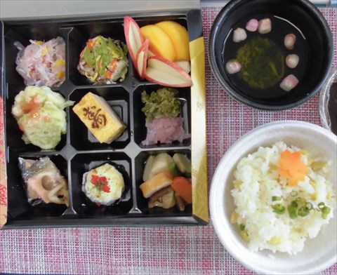 開所記念弁当♪ いわしろ紀行は、今日で開所から6年を迎えました。 今日の昼食は、開所記念弁当です♪ ◎栗おこわ ◎すまし汁 弁当上段左側より ◎マリネ ◎しんじょう ◎水菓子 ◎長芋の青のり揚げ ◎寿たまご ◎香の物 ◎鮭の塩焼き ◎茄子のマヨネー焼き ◎炊き合わせ ※台風19号の影響で断水の被害が出ているため、 使い捨て食器を使用し提供しています。