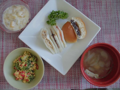 お誕生日献立♪ 10月2日は、熱海ユニットのS様のお誕生日です! 希望されたメニューは「ジャムパン」でサンドイッチにしてお祝いです♪ チョコ・ツナのサンドイッチ、ミニあんぱん、ブロッコリーのサラダ、 フルーツヨーグルト、オニオンスープと一緒に提供しました♪ お誕生日おめでとうございます(^^)♪