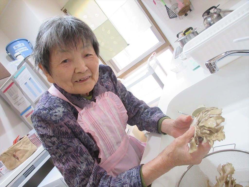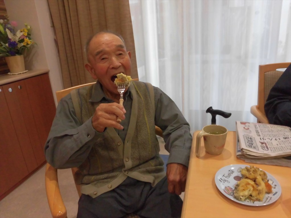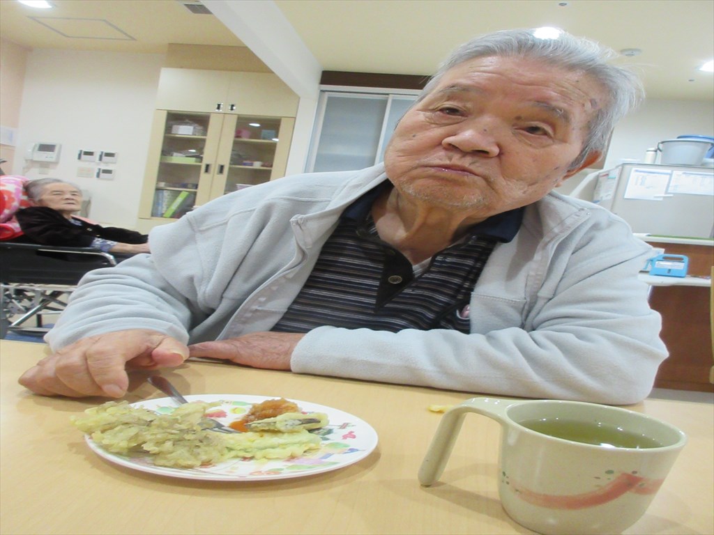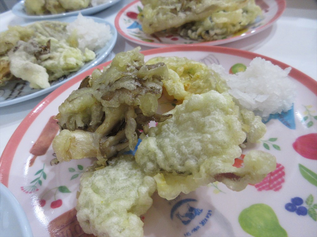 岳塩沢ショートステイユニットから良い匂いが・・・ 秋の味覚で天ぷら♪ 岳塩沢ショートステイユニットから良い匂いが・・・ 秋の味覚、サツマモ、かぼちゃ、舞茸を使った 天ぷらを作っていました!! さっくさくで美味しい~(^^)v