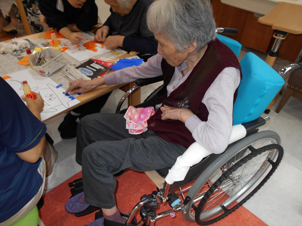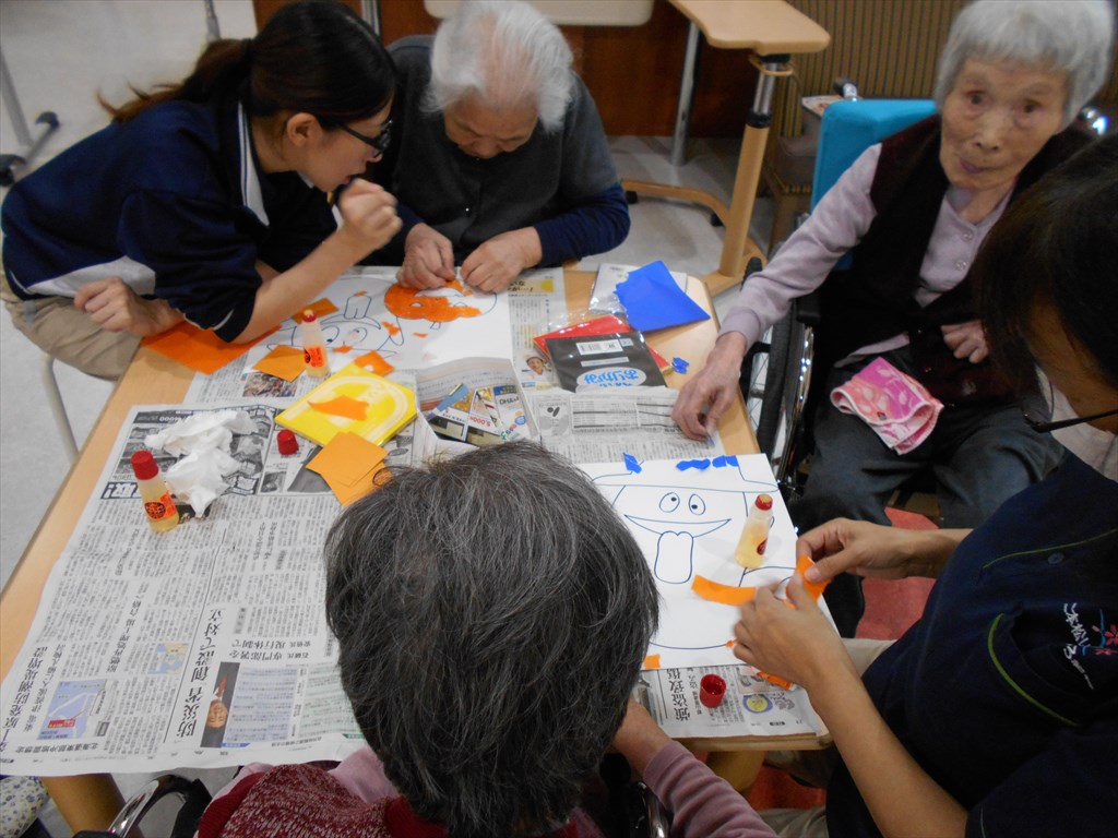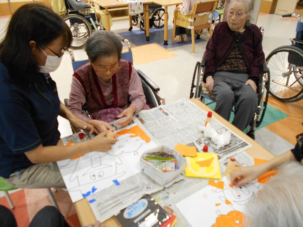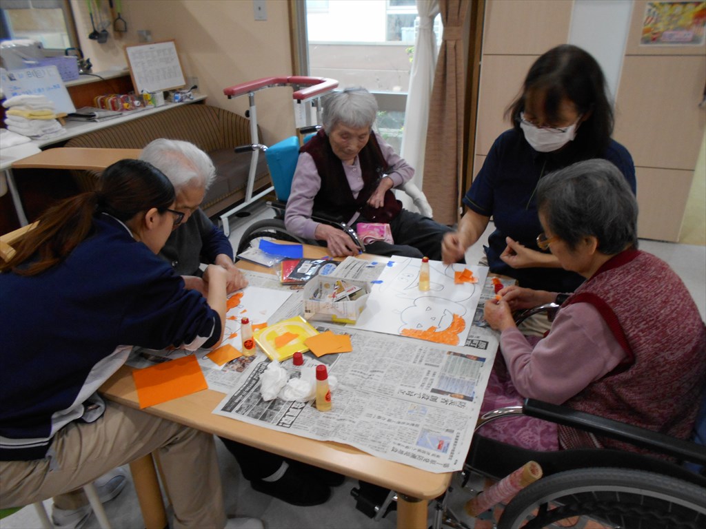 ~ハロウィンにむけて~ 昼夜の寒暖差も大きくなり いよいよ秋を迎えようとしています。 飯坂・穴原ユニットでは季節を感じていただこうと ハロウィンの貼り絵を入居様と一緒に作成しました。 スポーツ、読書、食欲などなど 秋はいろいろな事に打ち込める季節です。 皆さんはどんな秋を過ごされますか? ちなみ私は食欲の秋よ・・・・いえいえスポーツです(汗)