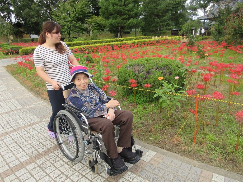 ★安達ヶ原の曼珠沙華★(まんじゅしゃげ) 二本松市安達が原ふるさと村の曼珠沙華(まんじゅしゃげ)を ショートステイの皆様と見てきました。 園内を散歩して休憩(?)を挟みながら、 たくさんの曼珠沙華と皆様と記念撮影!! 皆様お疲れ様でした。