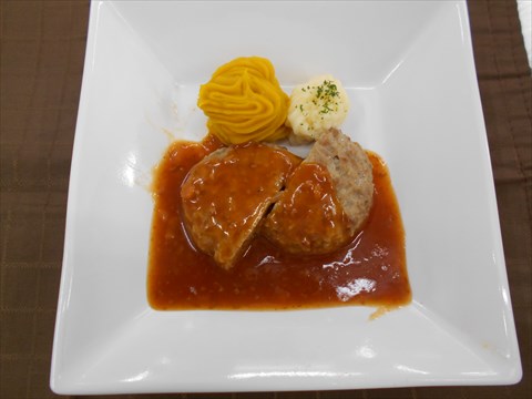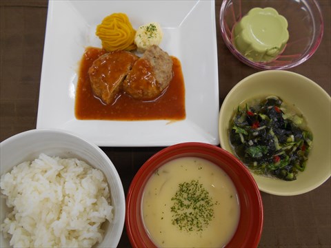 お誕生日献立♪ 9/20は、土湯ユニットのS様と飯坂ユニットのW様の お誕生日でした♪ S様の希望されたメニューは「煮込みハンバーグ」 W様の希望されたメニューは「和風抹茶プリン」でした。 ごはん、わかめサラダ、コーンスープと一緒に 提供しました♪ お誕生日おめでとうございます♪(^^)
