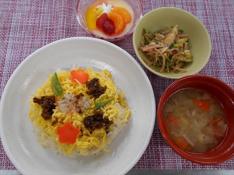 お誕生日献立♪ 3月10日は 土湯ユニット A様 芦ノ牧ユニット O様 のお誕生日でした♪ 希望されたメニューは A様「ちらし寿司」 O様「プリンアラモード」でした! お誕生日おめでとうございます(^^)!!