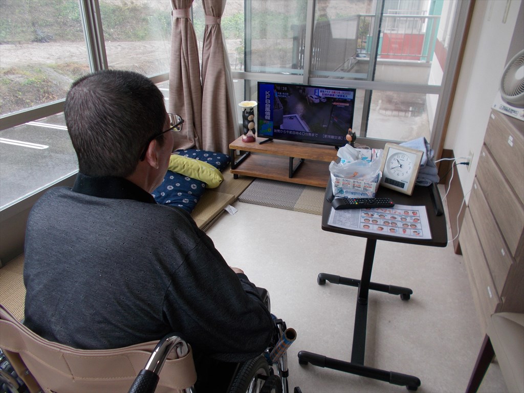 H様の日常<芦ノ牧・湯野上ユニット> 芦ノ牧ユニットのH様、 毎日談話室でテレビを見て過ごされます。 写真を撮った日は雨でしたが、 天気が良い日は日当たりも良く、 春・秋は心地よい暖かさです♪ 畳と座布団もあるので、暖かいと、つい横になりたくなりますね(- -)zzz 飴を舐めて、好きな番組を選んで、観て、 ゆったりとした時間を過ごされています(^^♪